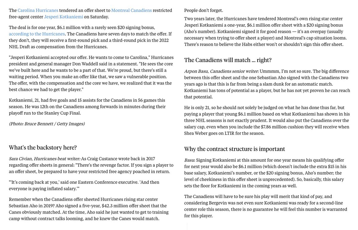On Saturday the Hurricanes still tried to exact some sort of revenge for the attempt and signed restricted free agent Jesperi Kotkaniemi to a one-year 61 million offer sheet. I actually dont consider it an offer sheet but a hostile offer as payback for Montreal. Montreal now has seven days to match or walk away with some much needed salary cap space a.
